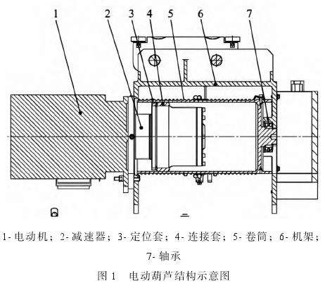 電動葫蘆由多個結構部件組成,每個部件在設備的運行中都扮演著至關重要的角色。電動葫蘆的基本組成包括電動機、減速器、卷筒、定位套、連接套、軸承、機架等(圖 1)。減速器的功能是把電動機的高轉速小轉矩轉換成低轉速大轉矩輸出,以帶動卷筒。鋼絲繩纏繞在卷筒上,利用卷筒的轉動完成負載的升降。定位套及連接套用來保證各零部件間的連接準確,避免出現傳動誤差或零部件松脫現象。